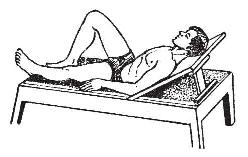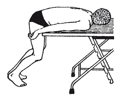 Поза полулежа на животе на массажном столе, тазовая область пациента находится за пределами стола, нижние конечности полусогнуты в коленных суставах, стопы опираются на носочки, руки вытянуты вдоль туловища (рис. 8).