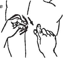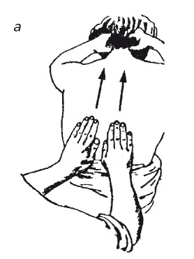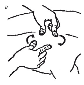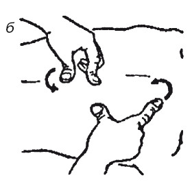 2-й способ – массажист справа и слева от позвоночника помещает подушечки (концевые фаланги) I пальцев и производит винтообразные движения в сторону позвоночника, передвигаясь от сегмента к сегменту снизу вверх. Остальные пальцы (II–V) служат опорой или перемещаются на боковые поверхности тела пациента. Прием можно проводить по одну сторону от позвоночника или на обеих одновременно.