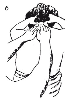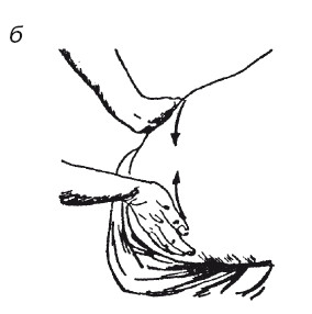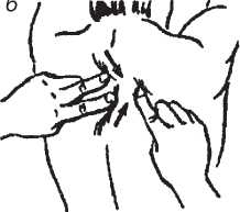 Рис. 16. Прием перемещения: а – выполнение приема; б – слева от позвоночника; в—справа от позвоночника