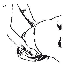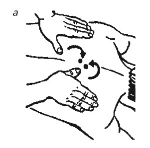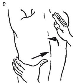 – смещение по плоскости подкожной клетчатки по отношению к фасции. Согнутые пальцы помещают на соответствующие места, медленно перемещая их в обе стороны. При увеличении напряжения степень перемещения меньше.