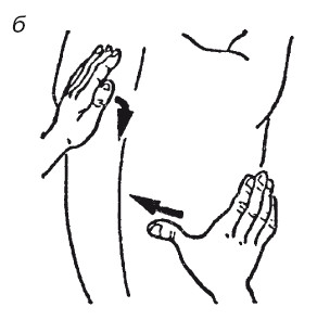 Рис. 10. Поясное сегментарное поглаживание: а – начало движения; б – направление движения; в – окончание