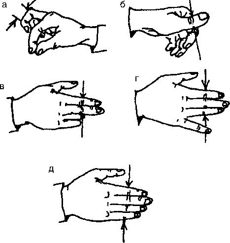 Рис. 1. Способы определения индивидуального цуня: а – 1 цунь; б – 1 цунь; в-1,5 цуня; г-2 цуня; д-3 цуня