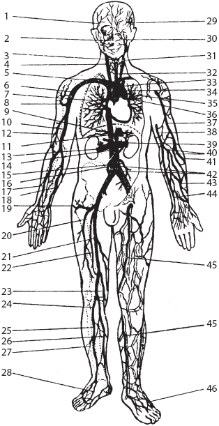 Рис. 10. Система кровообращения: 1 – поверхностная височная артерия; 2 – лицевая артерия, 3 – позвоночная артерия; 4 – общая сонная артерия; 5 – подключичные артерии и вена; 6 – подкрыльцовые артерия и вена; 7 – корень легкого, 8 – артерии, питающие плечевую кость; 9 – печеночные вены, 10 – плечевая артерия; 11 – чревный ствол; 12 – глубокая артерия плеча; 13 – верхняя брыжеечная артерия; 14 – брюшная часть аорты, 15 – нижняя брыжеечная артерия; 16 – нижняя полая вена; 17 – лучевая артерия; 18 – локтевая артерия; 19 – глубокая артерия, огибающая подвздошную кость, 20 – латеральная артерия, огибающая бедренную кость, 21 – бедренные артерия и вена; 22 – глубокая артерия бедра; 23, 24 – подколенная артерия; 25 – передняя большеберцовая артерия; 26 – задняя большеберцовая артерия, 27 – малоберцовая артерия; 28 – тыльная артерия стопы, 29 – поверхностная височная вена, 30 – лицевая вена; 31 – наружная яремная вена; 32 – внутренняя яремная вена; 33 – верхняя полая вена; 34 – дуга аорты, 35 – легочный ствол; 36 – легочные вены; 37 и 41 – латеральная подкожная вена руки; 38 и 44 – медиальная подкожная вена руки; 39 – почечные вены и артерии; 40 – промежуточная вена локтя; 42 – общие подвздошные артерия и вена; 43 – промежуточная вена предплечья; 45 – поверхностные вены бедра и голени; 46 – тыльная венозная сеть стопы локтя