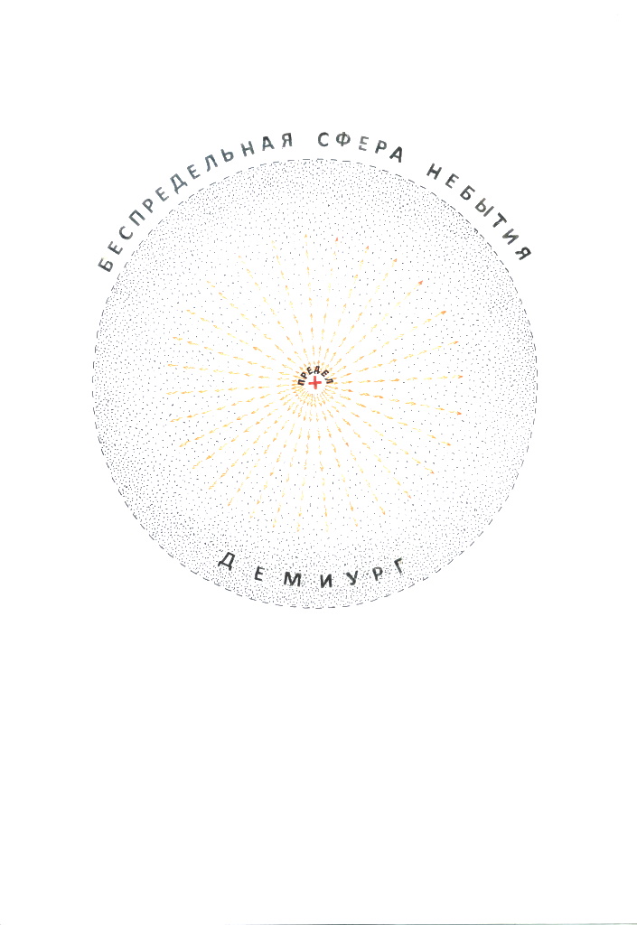 Из сказанного выше становится очевидным, что «благо» Демиурга было проявлено не только в концентрации им в точку своего духовного потенциала, что позволило ему созерцать вечно тождественный и идеальный «первообраз» − сферу истечения Света (Рис. 4). С метафизической стороны его возникновение есть следствие сферического истечения вибрирующего Света от наведенного заряда созидания − глаза Бога, который в одной из пятнадцати каббалистических диаграмм помещен в центре куба, изображающего Новый Иерусалим. Такая форма созерцания Творцом себя является проявлением божественного ума.