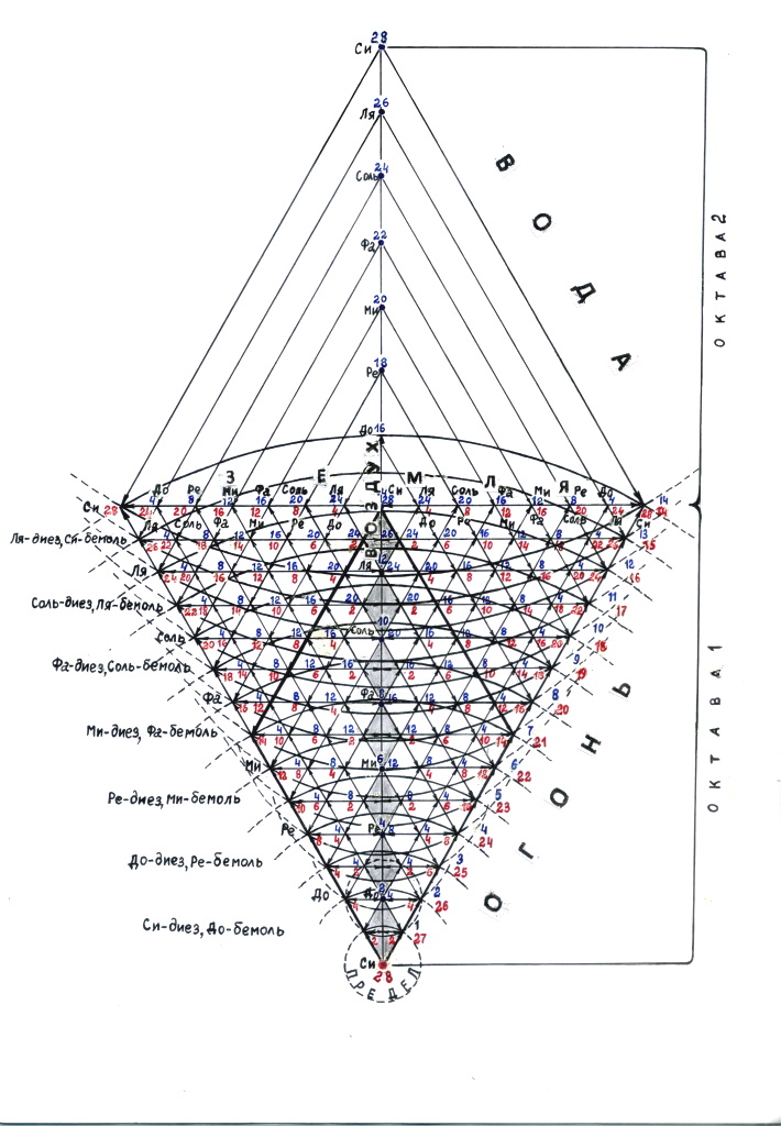 Рис. 3. Высшие космические стихии «огонь», «вода», «воздух» и «земля» в структуре напряжения созидающего луча Света (двухмерное отображение)