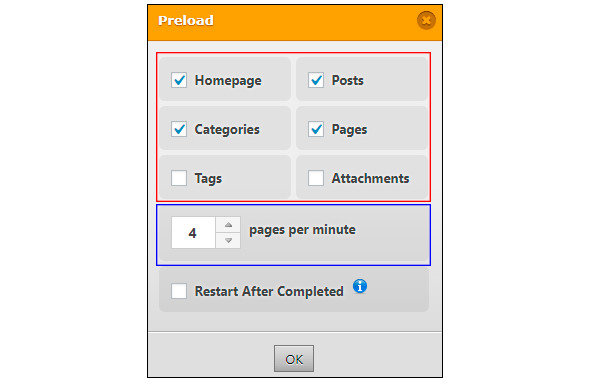 На картинке ниже красная область отвечает за выбор разделов для которых будут созданы статичные страницы. А вот синяя отвечает за их количество, созданных в минуту: 4 – достаточно, чтобы не создавать большую нагрузку на сервер.