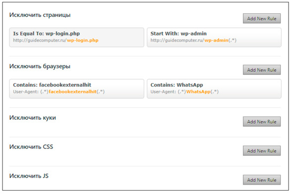 В данном разделе можно запретить кэшировать определённые страницы, браузеры, куки, css и js.