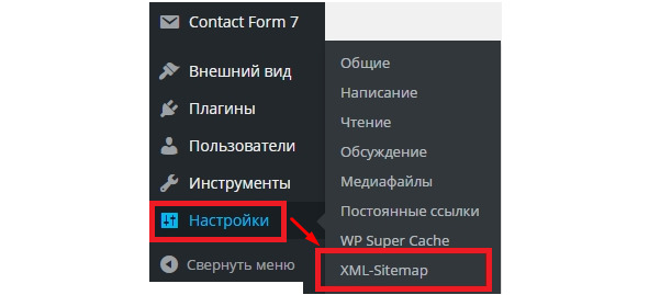 Чтобы попасть на страницу настроек плагина, перейдите по вкладке: Настройки – XML Sitemap.