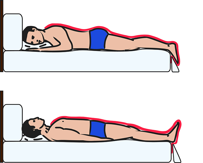 Ещё одна моя разработка – устройство для сна. В любимом нами мультфильме про деревню Простоквашино кот Матроскин говорил дяде Фёдору, что тот неправильно ест бутерброд – колбасой вверх, а надо вниз. Так вот я говорю, что люди, которые любят спать на спине и на животе, спят неправильно, так как человек, ложась на кровать, ориентируется относительно спинки в изголовье кровати. Но если он ложится чуть выше или ниже, то ничего не меняется. Я же пришел к выводу, что ориентироваться надо не по расположению головы, а по расположению ступней. И располагать их нужно так, чтобы когда человек лежит на спине, пятка свисала с матраса. При таком положении вам будет удобно лежать, так как опора ног не будет приходиться на пятки, что позволит разгрузить коленный сустав и нога всей поверхностью ляжет на матрас. В таком положении вам также будет удобно спать и лежа на животе: когда ваша ступня будет свисать с матраса, вам не потребуется валик, который подкладывают для удобства во время массажа. Конечно же, чтобы правильно ложиться в таком положении, необходимо либо заказывать специализированный матрас под ваш рост, либо на имеющийся матрас устанавливать специально подобранную по размеру подушку, упираясь в которую головой вы займёте правильное положение. Для того чтобы вам было комфортно и ваши ноги не мерзли, я разработал способ крепления одеяла к кровати, показанный на рисунке. Используя мою разработку, вы будете комфортно спать и на спине, и на животе. В положении же лежа на боку это дополнение влияния не оказывает. Применение этого способа поможет вам ночью отдохнуть и забыть про постоянно сбивающееся во время сна одеяло.