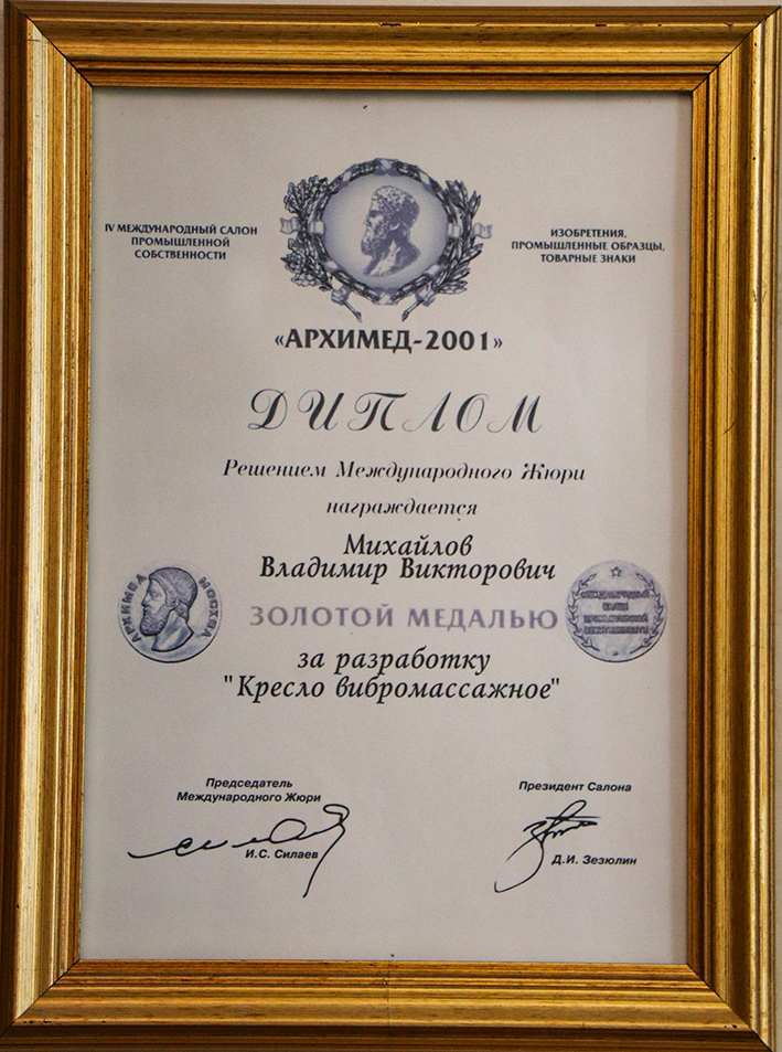 В 2000 году я был первым в России, кто разработал вибромассажное кресло. Я даже получил за него свою первую золотую медаль на Международном Салоне «Архимед», который проходил в Сочи в 2001 году. Но так как у меня не было необходимых производственных мощностей, я так и не смог внедрить эту разработку в производство.