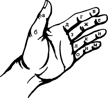 а, б – суставы большого пальца. в, г, д – суставы указательного пальца. е, ж, з – суставы среднего пальца. и, к, л – суставы безымянного пальца.