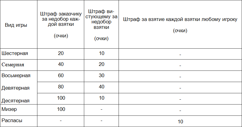 Если заказчик игры обещал взять семь взяток, а взял только шесть, то он штрафуется за это. Штраф за недобор одной взятки равен стоимости всей игры в очках. Например, при шестерной игре за каждую недополученную взятку пишется штраф в размере 20 очков, при семерной – 40 очков, при восьмерной – 60 очков и т. д. согласно данным таблицы 3.01. Эта таблица и эти расценки могут быть другими, всё зависит от того какой именно вид преферанса применяется и, кроме того, расценки могут быть установлены с согласия всех игроков любыми, какие им понравятся, но в большинстве случаев игроки придерживаются общеизвестных стандартных величин.
