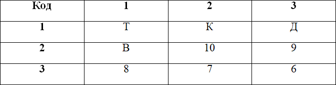 д) так как пара должна иметь вид: дама треф – восемь бубен, то по масти дамы можно определить номер строки из вертикального ряда П – Ч – Т – Б таблицы 6. Это строка номер три;