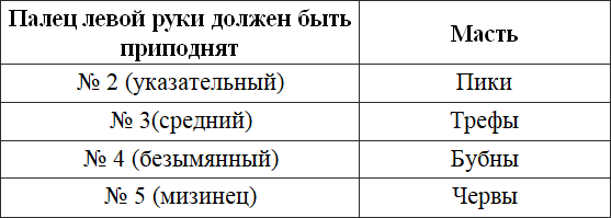 Во многих случаях шулеру очень важно знать, с какой карты и какой мастью надо ходить. Если у шулера есть сообщник, не принимающий участия в игре, но наблюдающий за игрой сзади, за спинами игроков, то эта задача легко решается при помощи системы сигнализации незаметными условными жестами. Ими зашифровывается масть и номинал карты. Один жест – на масть, второй жест – на номинал. Применяется следующая система: