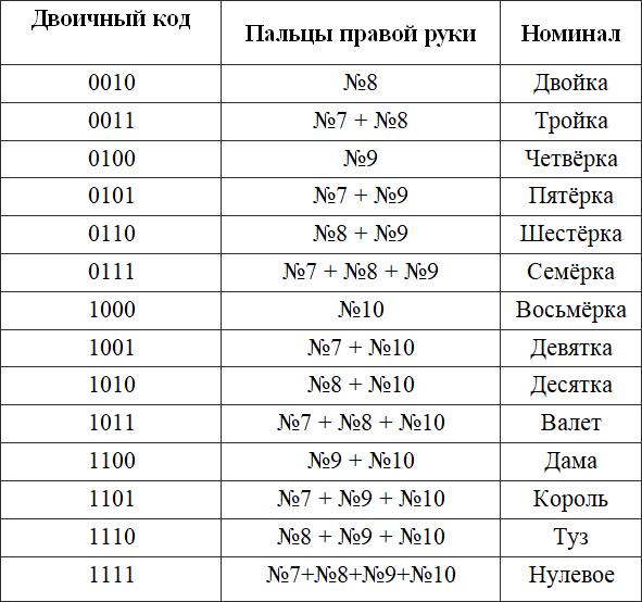 Номинал карты показывают другой, правой, рукой, четырьмя пальцами при помощи двоичного кода, согласно таблице 5.