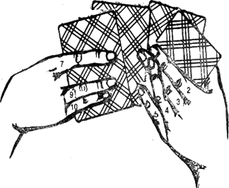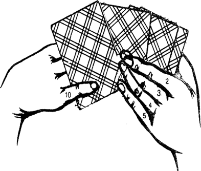 Из таблицы 5 видно, что четыре пальца правой руки являются четырьмя разрядами в двоичной системе, на каждый палец – один разряд. Информацию о номинале карты несут пальцы правой руки, оставшиеся на крапе, остальные пальцы правой руки должны быть спрятаны на лицевой стороне веера. Исходным положением, то есть первоначальным, не несущим полезной информации, является, согласно таблице 5, положение последней строки, когда все четыре пальца лежат на крапе. При показе номинала карты при помощи правой руки не требуется оттопыривать пальцы, они должны спокойно лежать на крапе. Полезная информация здесь зависит от того, какие именно пальцы лежат на крапе. Если на крапе лежит только один средний палец (№ 8), то это двойка, согласно таблице 5, рис. 59. Если – два пальца, № 7 и № 8 (указательный и средний), то это тройка, рис. 60. И так далее, на основании таблицы 5.