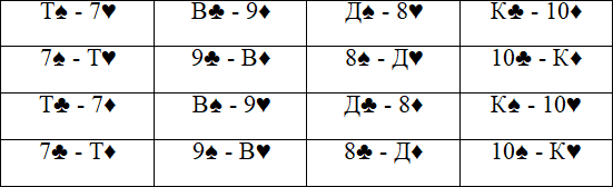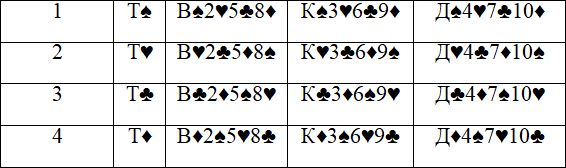Т♠7♥В♣9♦Д♠8♥К♣10♦7♠Т♥9♣В♦8♠Д♥10♣К♦Т♣7♦В♠9♥