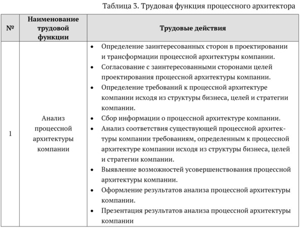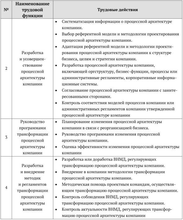 Дополнительно я приведу здесь описание трудовой функции процессного архитектора из профессионального стандарта. В соответствии с Профессиональным стандартом «Специалист по процессному управлению» №1138 (утвержден приказом Министерства труда и социальной защиты РФ от 17 апреля 2018 г. №248н) процессный архитектор в рамках обобщенной трудовой функции «Проектирование и трансформация процессной архитектуры компании» выполняет следующие трудовые функции: