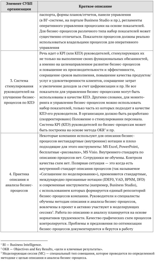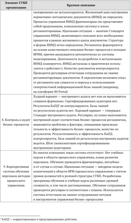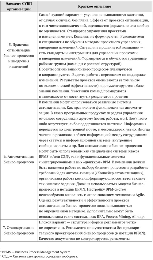 Далее в таблице представлено краткое описание возможного «уровня зрелости» элементов СУБП от «очень низкого» до «высокого» – вы можете выполнить экспертную оценку уровня зрелости вашей системы работы с бизнес-процессами.