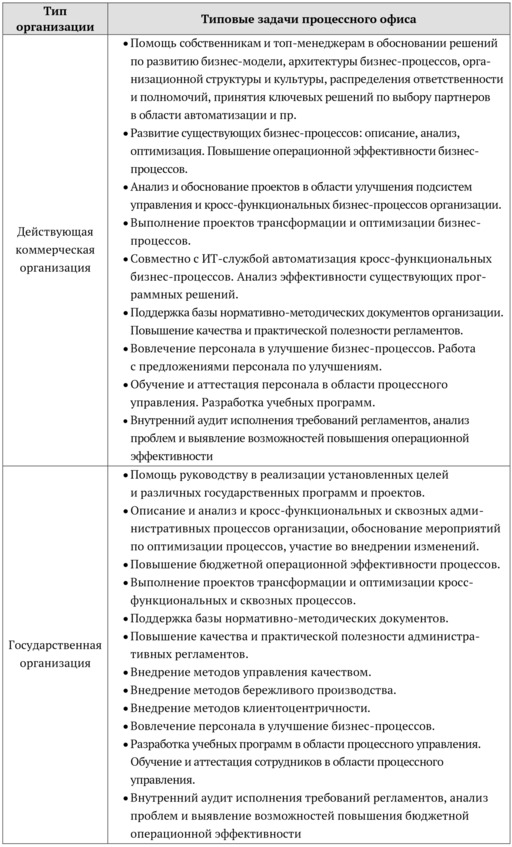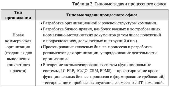 В таблице 2 представлены возможные типовые задачи процессного офиса в различных ситуациях.