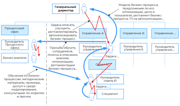 Подчеркну, что задачи по работе с бизнес-процессами ставятся первым лицом компании руководителям управлений, а не процессному офису. Делается это регулярно, один раз в 2—3 недели.