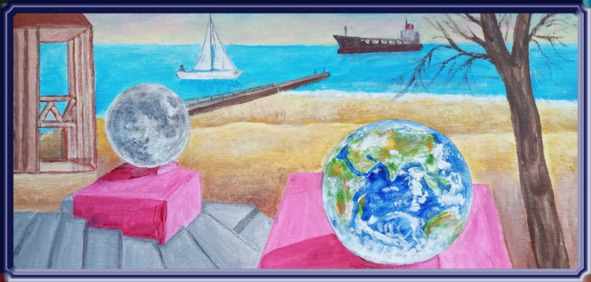 Но мой выбор пал на хорошо известные одесситам два шара пляжа. Один из них изображаю в виде земного шара. Другой меньший (в перспективе) —Луна.