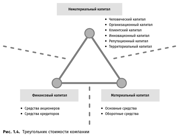 При этом изначально целевой функцией данной модели управления было обеспечение роста благосостояния акционеров (Shareholders Wealth Maximization Model), что в свою очередь привело к возникновению целого ряда финансовых метрик (FCF, TSR, MAR, OAR, TBR, WAI, EVA, MVA, SVA, CVA), способных с разных сторон показать произошедшие изменения и помочь оценить эффективность действий менеджмента. Развитием этой целевой функции стала модель максимизации стоимости (ценности) компании (Stakeholder Wealth Maximization Model) как для акционеров, так и для других поставщиков капитала – стейкхолдеров[6], к которым относятся сотрудники, поставщики, клиенты, общество и другие заинтересованные субъекты. Важнейшая причина подобного рода изменений – расширение понятия «капитал». Сегодня это уже не просто финансовый ресурс, предоставленный собственниками или кредиторами. Это все ключевые ресурсы, компетенции, без которых невозможно устойчивое развитие компании и рост ее стоимости. В эпоху цифровизации, информационных технологий наряду с финансовым и материальным капиталом возник и неосязаемый, нематериальный капитал как некое понятие, объединяющее все то, что может стоять за нематериальными активами компании. Для совокупной характеристики этих видов капитала я использую термин «треугольник стоимости компании», где каждый из трех образующих его элементов прямо или косвенно влияет на ее стоимость (рис. 1.4).