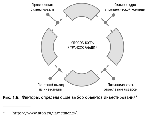 Акцентируя внимание на элементах треугольника стоимости компании в процессе финансового анализа, особенно на составляющих нематериального капитала, потенциальные инвесторы могут избежать ненужных рисков, повысить обоснованность выбора объектов инвестирования в пределах допустимого уровня аппетита к риску, получать объективную оценку стоимости компании-цели. Например, инвестиционная компания «АТОН», реализуя стратегию прямых инвестиций, декларирует следующие факторы, определяющие выбор объектов инвестирования (рис. 1.6).