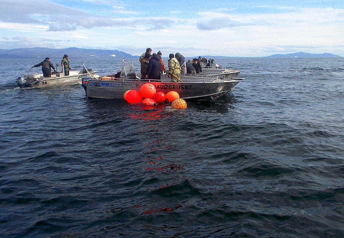 Когда мы вышли на берег, охотники вели неторопливые приготовления. Чукчи всё делают неспеша, им потеть никак нельзя, иначе потом можно замёрзнуть. Нам, туристам, выдали спасательные жилеты, и мы сели в алюминиевые моторные лодки.