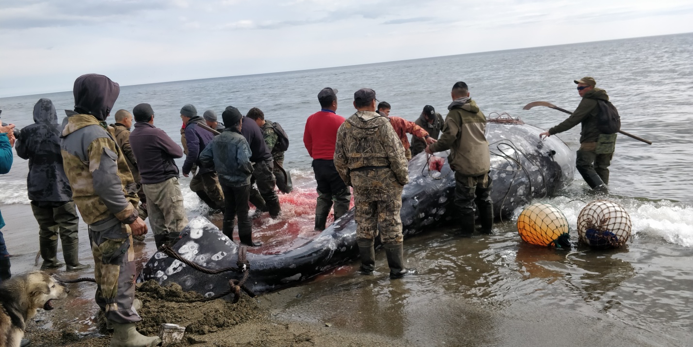 Затем охотники подтянули китовый хвост к лодке, вырезали в нём квадратное отверстие и просунули канат, закрепив его на корме. Чукчи работали слаженно, каждый знал свой манёвр.