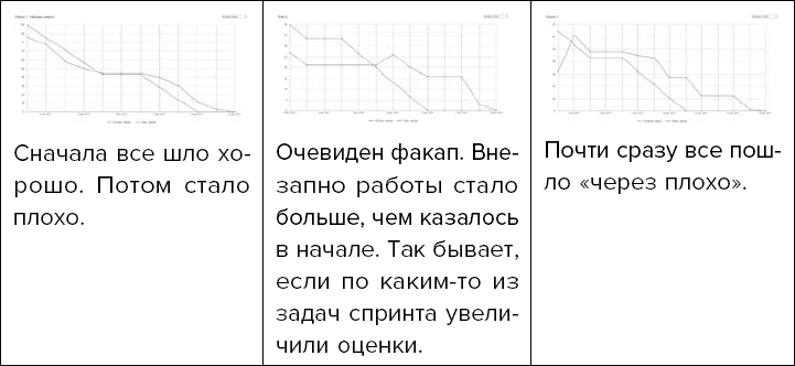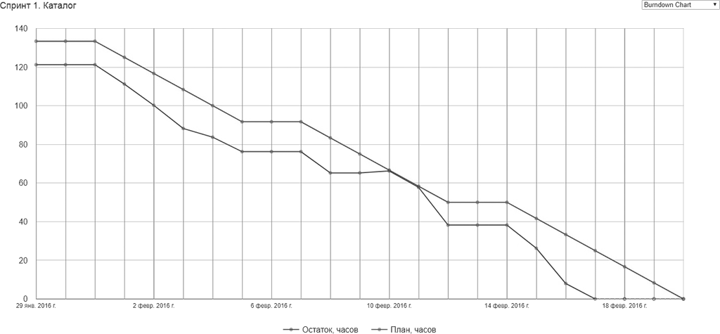 Синяя линяя – фактически оставшееся время оцененных задач. Красная – плановое время. Мы видим, как по ходу спринта «сгорала» работа. Команда доделала все намного раньше плана, однако во второй трети спринта линии совпали. Тут нужно внимание.