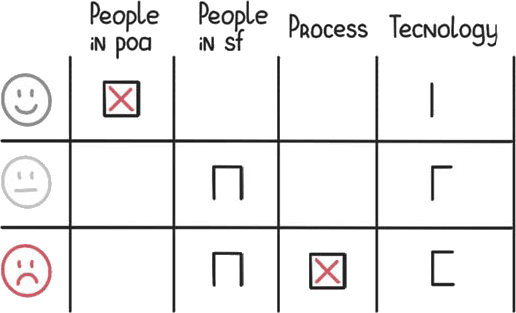 2. Happiness radar. Чертим матрицу 3×3. По вертикали – смайлики настроения. По горизонтали – Технологии, Люди, Процесс. Каждый ставит палочку, насколько удовлетворен каждым из аспектов. Стикеры нужны для фиксации предложений по ходу.