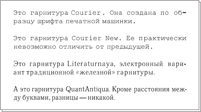 Авторские права распространяются только на программный код и название шрифта, поэтому вполне законно (хотя, может быть, не слишком этично) нарисовать шрифт заново по образцу и выпустить в мир под другим названием. Не удивляйтесь, если вы не сможете отличить шрифт Courier от шрифтов Courier New, CourierC, CourierCTT, Courtier и пр. – это лишь разные версии одной гарнитуры от разных фирм (рис. 1.2).