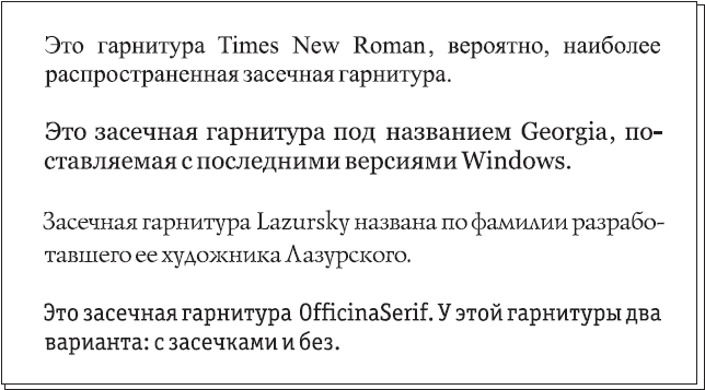 К примеру, наиболее распространенный шрифт с засечками Times New Roman, поставляемый с операционной системой Windows, применяется очень часто. В то же время некоторые дизайнеры считают, что использовать его в печати нежелательно, поскольку при разработке шрифта предполагалось, что его основное предназначение – отображение на экране. В последние версии операционной системы Windows входит гарнитура Georgia, которая очень похожа на Times New Roman (рис. 1.3), но ориентирована в первую очередь на печатное воспроизведение.