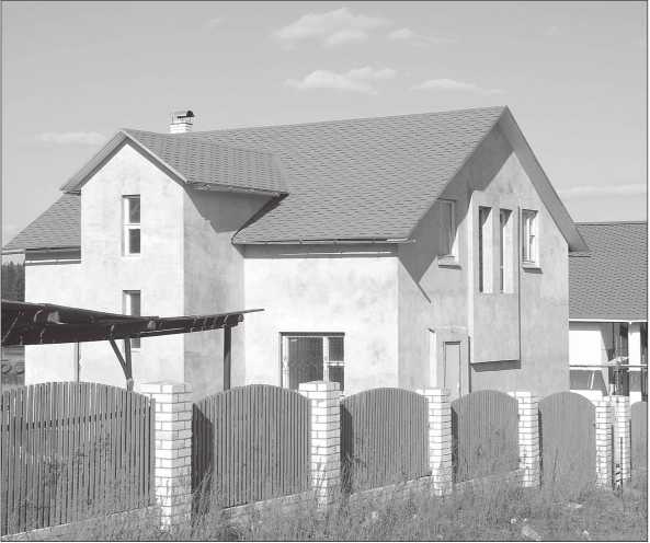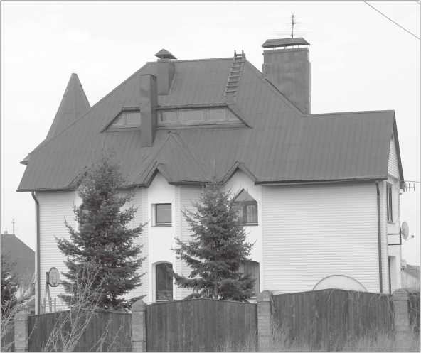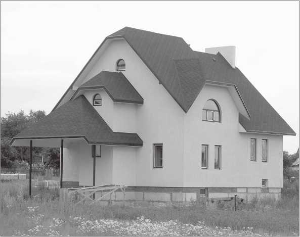 Полувальмовая крыша прекрасно вмещает под собой дополнительные жилые помещения, которые составляют 70 % от площади первого этажа. Конечно, такая конструкция несколько тяжеловесна, но в сочетании с легким балконом, изящными оконными переплетами и другими деталями ее можно признать вполне удовлетворительной.