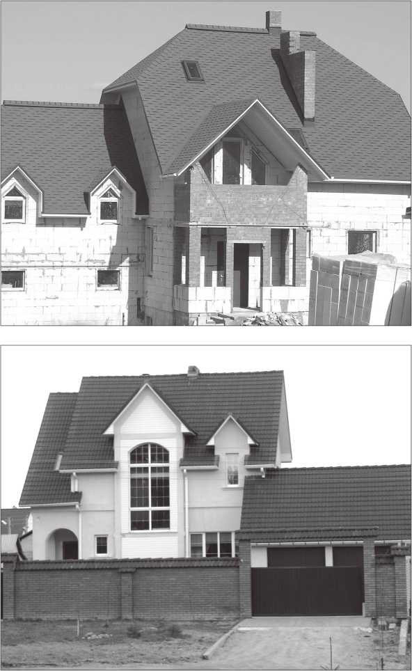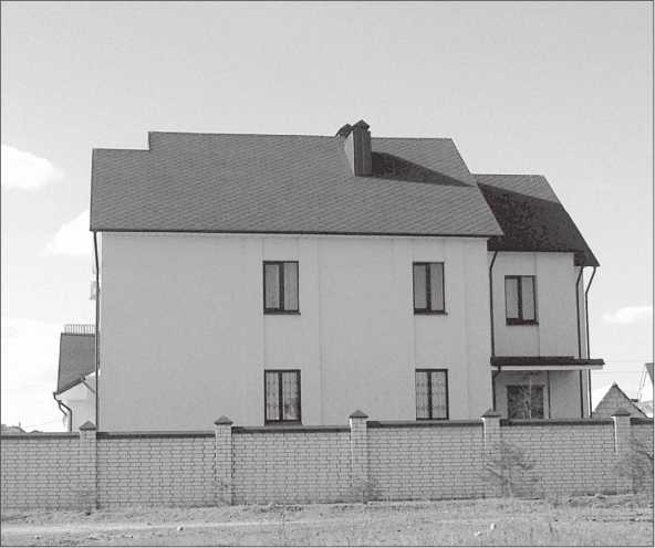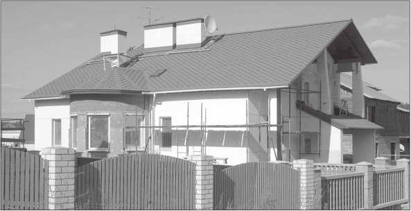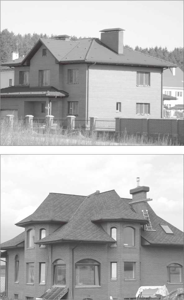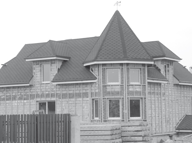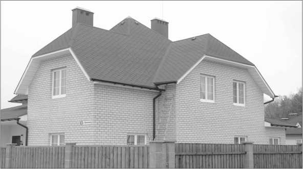 Вальмовая крыша существенно ограничивает возможности использования расположенного под ней пространства. Устройство надстройки здесь, скорее всего, продиктовано необходимостью естественного освещения помещений второго этажа. Угловой излом еще более усложняет форму крыши. Достаточно сложная стропильная система, дополнительный расход кровельных материалов, связанный с косой резкой черепицы, большое количество ендов, ребер и примыканий, а также фасонных изделий значительно увеличивают стоимость кровли. Видимо, такое архитектурное решение дома продиктовано вкусами его хозяина.