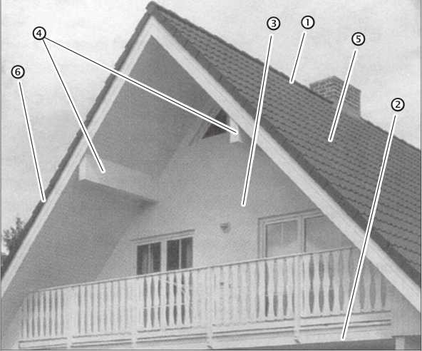 1 – конек; 2 – карниз; 3 – фронтон; 4 – прогоны, выступающие за плоскость фронтона; 5 – скат; 6 – двухскатный козырек, опирающийся на прогоны.