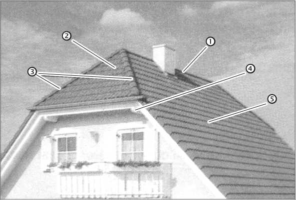 1 – конек; 2 – вальма; 3 – ребра; 4 – ендовы; 5 – скат.