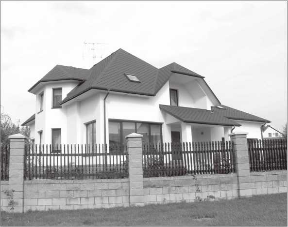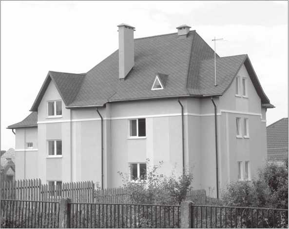 Двухскатная крыша с третьим фронтоном позволяет оборудовать под крышей помещения любого назначения с прекрасным естественным освещением. Стены первого этажа здесь подняты примерно на 1 м выше перекрытия первого этажа, что позволило значительно расширить второй этаж и превратить его в полноценный жилой блок для второй семьи. При этом далеко выступающие карниз и двухскатный козырек не принижают здания и позволяют разместить под ними защищенные от дождя уютные уголки для отдыха. Здесь некоторое усложнение крыши с экономической точки зрения можно считать вполне обоснованным.