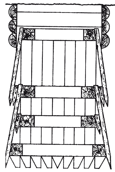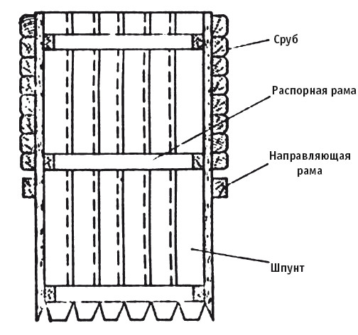 Более мощные плывуны (1–1,4 м) проходят, вбивая у основания сруба ряды косого шпунта длиной 0,7–0,9 м. Нижний ряд такого шпунта закрепляют каждый раз следующим рядом, расположенным выше. Затем косой шпунт укрепляют внутренним срубом или внутренним шпунтом с распорками.