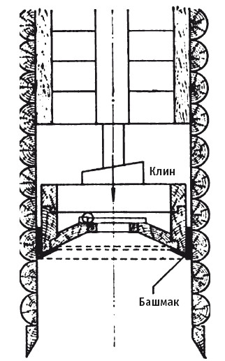 При устройстве шахтных колодцев плывун можно пройти только при благоприятных условиях – небольшой мощности, незначительном напоре, очень медленном движении. Проходят плывун, большей частью забивая шпунт. Шпунт – это стенка, переборка из досок или брусьев, соединенных между собой при помощи четвертей или углов. Нижние концы досок шпунтового ряда заостряют. Когда плывун расположен непосредственно над водоносным слоем – источником питания колодца или сам дает воду для колодца, пройти его можно с помощью внутреннего шпунтового ящика. Забивают шпунт строго по отвесу деревянным обухом или ручной бабой на глубину 30–35 см между направляющей и распорной рамами. Затем удаляют породу, не обнажая концы досок шпунта, после чего шпунт опять забивают. При глубине плывуна более 1 м забивать шпунт вручную почти не возможно, и тогда его забивают с помощью копра и чугунной бабы, скользящей по направляющим.