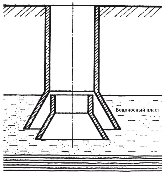 Водоприемную часть колодца в плывунах, особенно когда песок очень мелок и сильно разжижен, выполняют часто в виде двойного шатра. Вскрыв такой пласт, наращивание сруба прекращают и устанавливают второй шатер – водосборный, отступив на 0,35—0,4 м от стенок основного шатра. Сборку водосборного шатра надо производить очень тщательно снизу вверх с проконопачиванием его мхом и расшивкой рейками. Песок из внутреннего шатра при углублении шахты забрасывают между стенками, а воду откачивают.