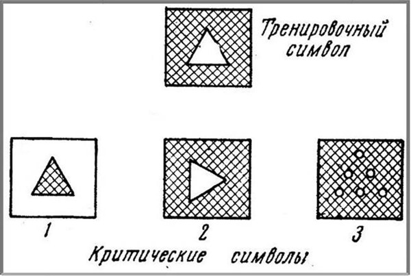Прежде чем перейти к описанию перцептивных операций и действий, следует остановиться на вопросе о критериях восприятия. Несмотря на то, что довольно детально разработаны некоторые критерии восприятия и создана совершенная техника их обнаружения и измерения, вопрос об их адекватности остается открытым. Так, например, в исследованиях, ведущихся по условно-рефлекторным методикам, возникновение положительной реакции или выработка дифференцировки нередко принимается за показатель адекватного восприятия. Хебб приводит данные экспериментов Лешли и др., в которых обнаружились разные степени восприятия «треугольности»[24]. Крыса, у которой была выработана реакция на белый треугольник на черном фоне, дает случайные ответы на другие варианты треугольника (1, 2, 3) (рис. 3–1).