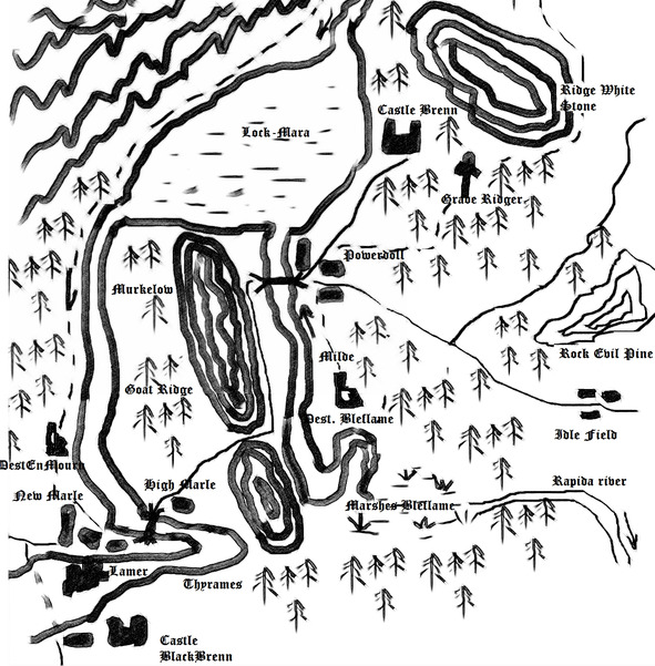 Карта первой части пути сира Томас из Брейи, что был пройден им в графстве Камбери, в краю озёрном, издавна именуемом также Лохк-Морен, кои деяния и привели к потрясениям великим, зовущихся Войной Драконов. Да хранят корону все святые и Белый Дракон!