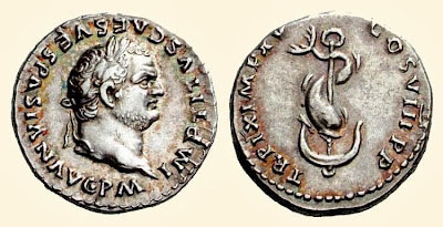 Илл. 26. Римская империя, 39–81 гг. Аверс: профильный портрет императора Веспасиана, реверс – дельфин, обвивающий якорь