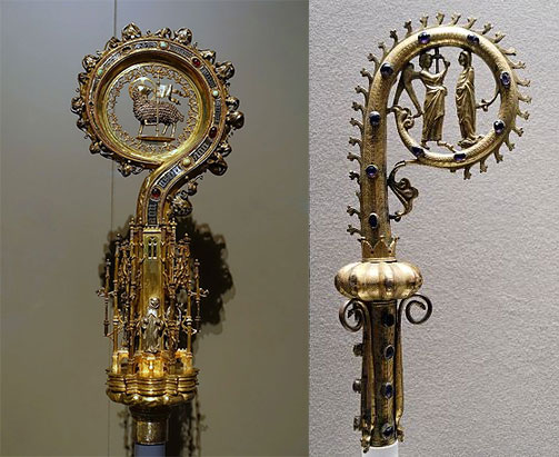 Аналогичным образом выглядит папский жезл (его также называют епископским). Сохранилось множество изображений христианских святых с такими жезлами, например, святых Петра, Омера, Николая и прочих. Жезлы на этих изображениях украшены по-разному, но всюду присутствует спираль. Образцы папских (епископских) жезлов также представлены на илл. 29 и 30.