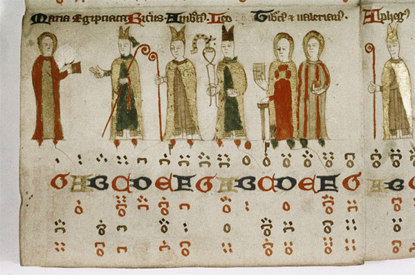 Илл. 30. Астрологический и церковный календарь в шести частях, к. XIV в. Дни памяти святых в апреле: Преподобная Мария Египетская, Святой Ричард Чичестерский, Св. Амвросий, Св. Лев, мученики Валериан и Тивуртий. Бодлеанская библиотека. Оксфордский университет