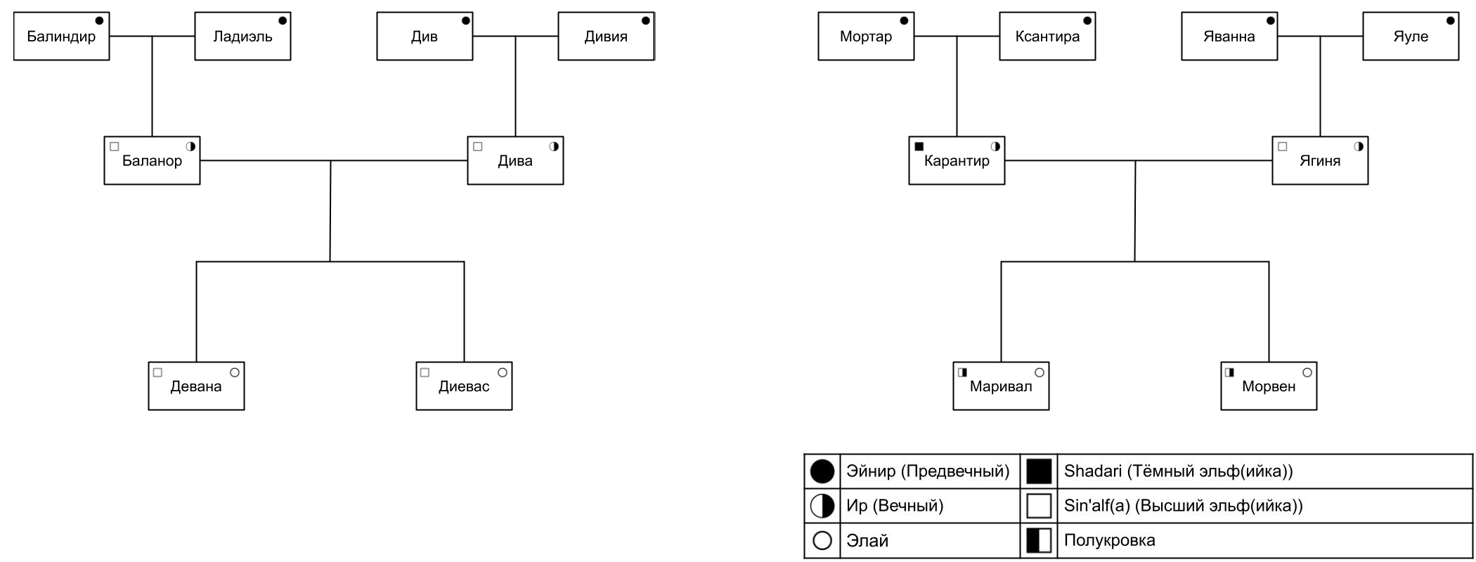 Некоторые божественные духи, как и люди, задумывались о смысле жизни, хотели жить в любви и согласии. Иры сотворили телесных потомков, которым эльфы дали имя Элай, а люди называли Эйниров, Иров и Элай Богами. Число Элай – четыре. Так, плодами любви между Баланором и Дивой были Девана и её младший брат Диевас, а Карантир с Ягиней родили Маривала и его младшую сестру Морвен.