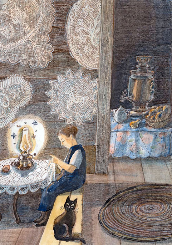 Девочка Скраешку, присмотревшись, как да что, стала помогать своим благодетельницам. Сначала подавала нужное, потом сама за крючок взялась. За простое. Простое выходило у неё так ладно, что сестрицы-кружевницы поглядывать стали на детское плетение – поглядывать и даже перенимать кое-что.