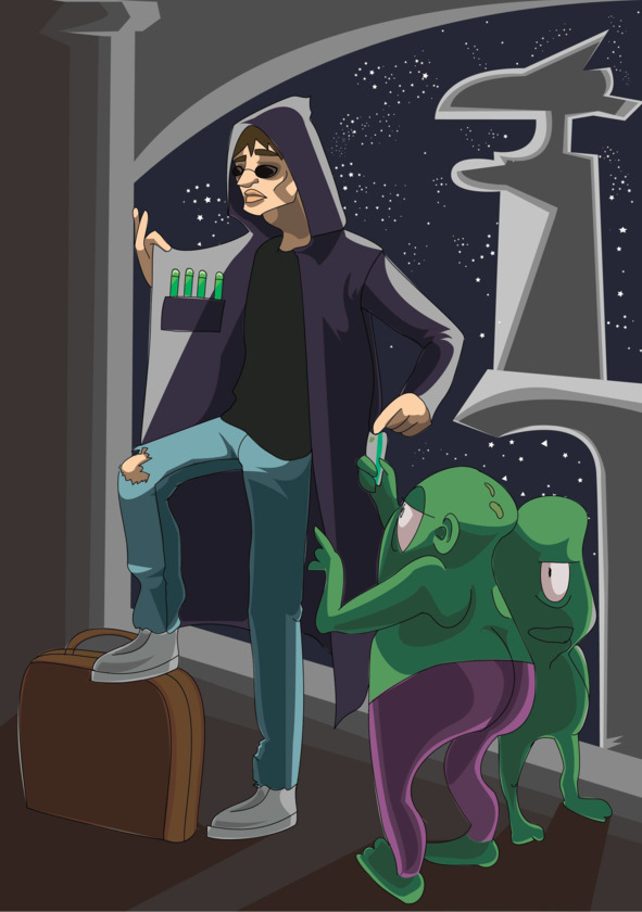 Пичужкин – странная фамилия для человека, продающего дешёвое пойло представителям внеземных рас. Ещё страннее, что этот преступный субъект выглядел, будто школьник – переросток. Высокий, худощавый, с веснушчатым носом, он носил вытянутые, словно смирительная рубашка, свитера, узкие серые брюки и потрёпанные кеды. Словно в целом свете иной одежды не существовало.